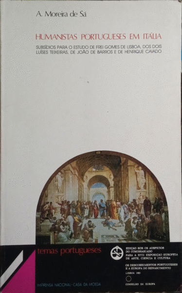 Clique nas imagens para aumentar. MOREIRA DE SÁ. (Artur) HUMANISTAS PORTUGUESES EM ITÁLIA.Subsídios para o estudo de Frei Gomes de Lisboa, dos dois Luíses Teixeiras, de João de Barros e de Henrique Caiado. Temas Portugueses. Imprensa Nacional-Casa da Moeda. Lisboa 1983. De 24x15 cm. Com 203, [x] pag. Brochado. Ilustrado. Exemplar com manchas de oxidação nas capas de brochura e folhas de guarda, e assinatura de posse borrada a preto à cabeça da folha de rosto. Referência: 1109IM649