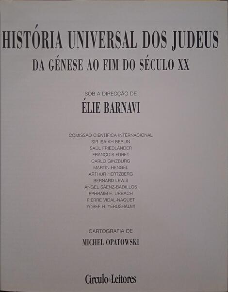 Clique nas imagens para aumentar. BARNAVI. (Élie) et al. HISTÓRIA UNIVERSAL DOS JUDEUS, DA GÉNESE AO FIM DO SÉCULO XX.Sob a direcção de... Cartografia de Michel Opatowski. Círculo de Leitores. Lisboa. 1992. De 30x24 cm. Com 299 págs. Encadernação do editor. Com sobrecapa de protecção. Profusamente ilustrado. Exemplar com leves danos à cabeça da sobrecapa de protecção. Referência: 2201PA067