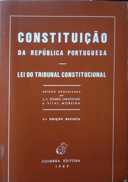 Clique nas imagens para aumentar. GOMES CANOTILHO. (J. J.) e Vital Moreira. CONSTITUIÇÃO DA REPÚBLICA PORTUGUESA DE 2 DE ABRIL DE 1976.(Alterada Pelas Leis Constitucionais N.ºs 1/82 e 1/89). Lei do Tribunal Constitucional. Edição organizada por... 2.ª Edição revista. Coimbra Editora. Coimbra. 1989. De 23x16,5 cm. Com [viii]; 213, [ii] págs. Brochado. Exemplar com assinatura de posse e etiqueta da Arco Íris na folha de anterrosto.