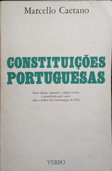Clique nas imagens para aumentar. CAETANO. (Marcelo) CONSTITUIÇÕES PORTUGUESAS. [6.ª EDIÇÃO][Por] Marcello Caetano. 6.ª Edição, segundo a edição revista e actualizada pelo autor com a análise da Constituição de 1976. Editorial Verbo. Lisboa. 1986. De 21x14 cm. Com 157, [ii] págs. Brochado. Referência: 2503DG466