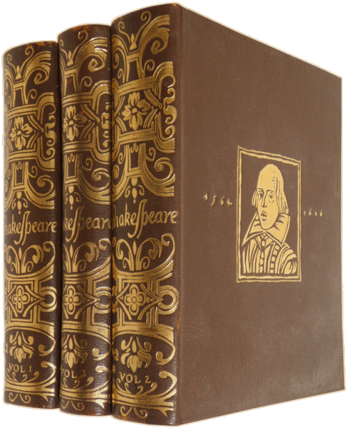 3 Volumes de 28x24 cm. Com 429, [ii]; 456, [iii]; [iv], 457-872, [v] págs. Encadernações editoriais inteiras de pele com ferros decorativos a ouro na lombada e nas pastas, reproduzindo um retrato de Shakespeare nas anteriores.
