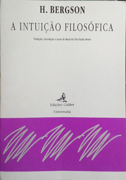 Clique nas imagens para aumentar. BERGSON. (Henri) A INTUIÇÃO FILOSÓFICA.Tradução, introdução e notas: Maria do Céu Patrão Neves. Revisão Literária: Lucinda Soares. Colecção Universalia, 4. Edições Colibri. Lisboa. 1994. De 20,5x14,5 cm. Com 70, [iii] págs. Brochado. Referência: 2508DG133