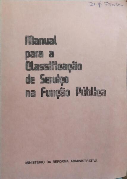 Clique nas imagens para aumentar. MANUAL PARA A CLASSIFICAÇÃO DE SERVIÇO NA FUNÇÃO PÚBLICA.Ministério da Reforma Administrativa. Lisboa. S.d. De 20,5x15 cm. Com 33 págs. Brochado. Ilustrado no texto com diagramas, e em extratexto com uma tabela desdobrável com diagrama. Exemplar com assinatura de posse na capa anterior. Referência: 2508RS694