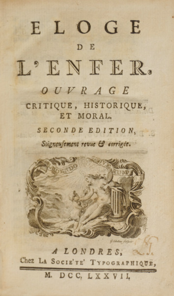 The first edition was published in 1759 in The Hague by Pierre Gosse, in two volumes in duodecimo, illustrated with 15 figures engraved by Sibelius. The work was translated into English almost immediately: 'The Praise of Hell: or, A view of the infernal regions...' (1760) and 'The praise of hell: or, a discovery of the infernal world' (ca. 1770), confirming international interest in Bernard"s satire. This second edition of 1777 was printed with a false place of printing, 'London', as confirmed by the British Library: 'The imprint is false, possibly printed in the Low Countries'. This practice was common among publishers in the Netherlands to circumvent censorship and ensure greater circulation of critical or heterodox works in the French and European markets.