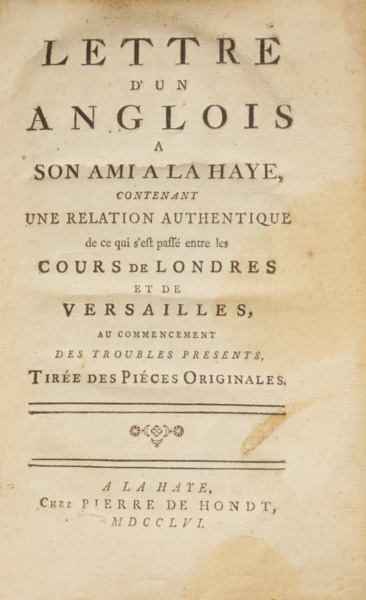 2 Works bound in one volume. In octavo. 20x13 cm. iv, 56, 52, [ii] pp. Contemporary full leather binding with raised bands, label and gilt lettering on the spine. Illustrated with a fold-out table at the end of the second work containing precise data on the seizures of neutral ships by British privateers and the decisions of the Admiralty courts, a central issue in Anglo-French maritime disputes of the period. It is a document of inestimable historical value. Printed in round characters and some italics on high-quality paper, decorated with simple headpieces and finishing fleurons. Copy with slight damp stains and curling of the pages due to moisture, most noticeable in the fold-out section. There are also small moth holes from the front board to the title page of the first work, as well as from page 41 to the title page of the second, without affecting the text. Very rare and important works of European diplomatic literature, published at the height of tensions preceding the Seven Years" War (1756-1763). They are part of the context of the so-called "Diplomatic Revolution" of 1756, which saw the realignment of traditional European alliances, with England abandoning its centuries-old alliance with Austria in favour of Prussia, leaving Austria to ally itself with France. The first work is only available in a few major European libraries and is referenced in the catalogue of the National Library of France. The second work, in this edition from The Hague, is one of three known editions from 1753 and is available in the Austrian National Library, but is not listed in the catalogue of the National Library of France. The other two editions were published in London (Edward Owen, in French) and Frankfurt am Main (Knoch und Esslinger, bilingual French-German edition). The combination of these two works in a single volume, with separate pagination and independent title pages, is a valuable bibliographic testimony to the diplomatic literature that preceded one of the most decisive conflicts in modern European history. The first piece, presented in the form of an anonymous letter from an Englishman to his correspondent in The Hague, is a response to the 'Lettres de l"Observateur Hollandais', as indicated by the catalogue of the National Library of France. The Observateur Hollandais was a political periodical edited by Jacob-Nicolas Moreau between 1755 and 1759, published under a false typographical mark in The Hague but printed in Paris, which disseminated the French perspective on European events through fictitious letters. This work is therefore a sophisticated piece of British diplomatic propaganda intended to counter the French narrative and justify London"s position to European public opinion. The choice of The Hague as the place of publication was not accidental, as this city had established itself as a centre for the dissemination of European political literature, allowing French censorship to be circumvented and ensuring wide circulation in continental diplomatic circles. The text claims to compile authentic documents from the diplomatic negotiations between London and Versailles, seeking to refute the French accusations disseminated in official memoranda. The intention is clear: to demonstrate that France systematically violated the agreements established by the Peace of Aix-la-Chapelle (1748), thus justifying the British belligerent position. The second work, dated 1753, reproduces the official correspondence between the Duke of Newcastle and the secretary of the Prussian legation in London, providing direct evidence of the complex negotiations that preceded the reorganisation of European alliances. The publisher Pierre de Hondt had established himself in The Hague as one of the leading disseminators of political and diplomatic works of the 18th century, specialising in the publication of official and semi-official documents. His workshop was renowned for the typographical quality and international distribution capacity of the works it produced. These publications were part of the common practice of the time of disseminating diplomatic correspondence through the press, constituting a primitive form of public diplomacy intended to influence not only government circles but also educated European opinion. Thomas Pelham-Holles, 1st Duke of Newcastle (London, 1693 – London, 1768), served as Secretary of State for almost five decades and was a central figure in British diplomacy during that period. Between 1749 and 1753, Newcastle led a diplomatic campaign to secure the election of Maria Theresa"s son as King of the Romans, seeking to form an "eminent majority" of imperial electors. Abraham Louis Michell (Vevey, 1712 – Berlin, 1782) served as secretary of the Prussian embassy in London during the critical period of negotiations leading up to the Seven Years" War, acting as the British government"s direct interlocutor in complex diplomatic matters relating to Prussian claims and growing tensions between the European powers. His correspondence with Newcastle provides direct testimony to the negotiations that led to the realignment of traditional alliances. Referências/References: Referência: 2508SB003