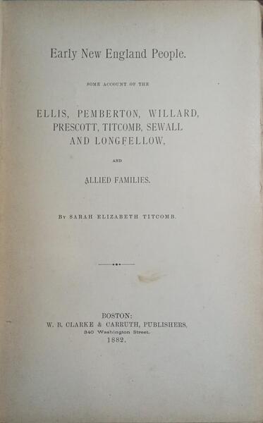 Clique nas imagens para aumentar. TITCOMB. (Sarah Elizabeth) EARLY NEW ENGLAND PEOPLE.Some Account of the Ellis, Pemberton, Willard, Prescott, Titcomb, Sewall And Longfellow, And Allied Families. By... W. B. Clarke & Carruth, Publishers. Boston. 1882. De 25x16 cm. Com [ii], 288, [v] págs. Encadernação em tela com ferros a ouro na lombada. Exemplar com danos à cabeça e no pé da lombada.