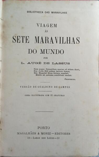 | Clique nas imagens para aumentar. AUGÉ DE LASSUS. (Lucien) VIAGEM ÁS SERE MARAVILHAS DO MUNDO.Por... L. Augé de Lassus. Versão de Gualdino de Campos. Obra illustrada com 21 gravuras. BiBliotheca das Maravilhas. Magalhães & Moniz, Editores. Porto. S.d. De 18x12,5 cm. Com 306, [i] págs. Encadernação em tela com ferros a ouro na lombada e nas pastas e corte das folhas carminado à cabeça. Ilustrado no texto com gravuras a preto e branco. Exemplar com sinais de manuseamento nos cantos da lombada e manchas nas folhas. Referência: 2509MA499 Local: SACO MA666-19 Caixa de sugestões A sua opinião é importante para nós. Se encontrou um preço incorrecto, um erro ou um problema técnico nesta página, por favor avise-nos.   | Pesquisa Simples          | ||