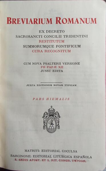Ex Decreto Sacrosancti Concilii Tridentini restitutum Summorum Pontificum cura recognitum. Cun nova psalterii versione PII Pap AE XII Jussu Edita.Juxta editionem novam typicam. Pars Hiemalis. Matriti: Editorial Coculsa. Barcinone: Editorial Liturgica Española. Madrid. 1955.