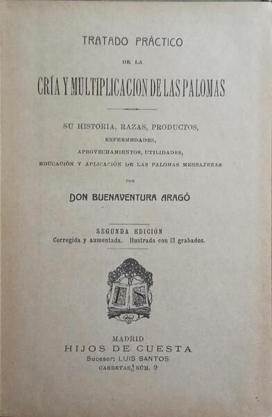 Clique nas imagens para aumentar. ARAGÓ. (Don Buenaventura) TRATADO PRÁCTICO DE LA CRÍA Y MULTIPLICACION DE LAS PALOMAS. [2.ª EDIÇÃO]Su historia, razas, productos, enfermedades, aprovechamientos, utilidades, educación y aplicación de las palomas mensajeras. Ilustrada con 13 grabados. Segunda Edición, Corregida y aumentada. Hijos de Cuesta. Madrid. S.d.[1930?] De 19x13 cm. Com [viii], 240 págs. Encadernação do editor. Ilustrado no texto com gravuras. Exemplar com assinatura de posse na folha de anterrosto e miolo ligeiramente solto da pasta anterior. Data retirada da WorldCat. Referência: 2509PA065