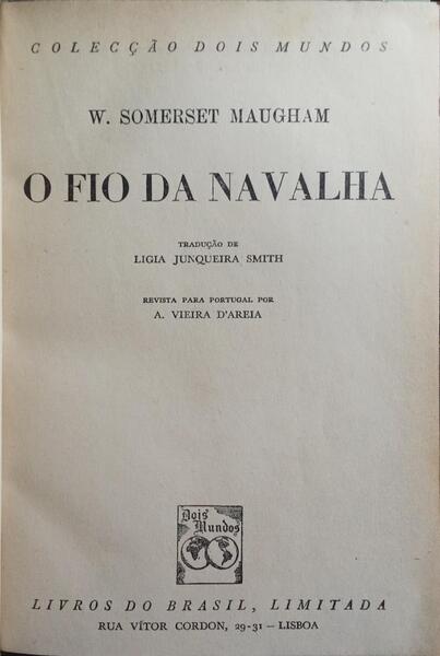 Clique nas imagens para aumentar. SOMERSET MAUGHAM. (William) O FIO DA NAVALHA.Tradução de Ligia Junqueira Smith. Revista para Portugal por A. Vieira d’Areia. Colecção Dois Mundos, 12. Livros do Brasil. Lisboa. S.d. [1950?]. De 21x15 cm. Com 276, [iii] págs. Encadernação com lombada e cantos em pele, rótulos e ferros a ouro na lombada. Folhas de guarda marmoreadas. Ilustrado com uma fotografia a preto e branco do autor, sobre papel couché. Data segundo a Porbase. Referência: 2509RS486