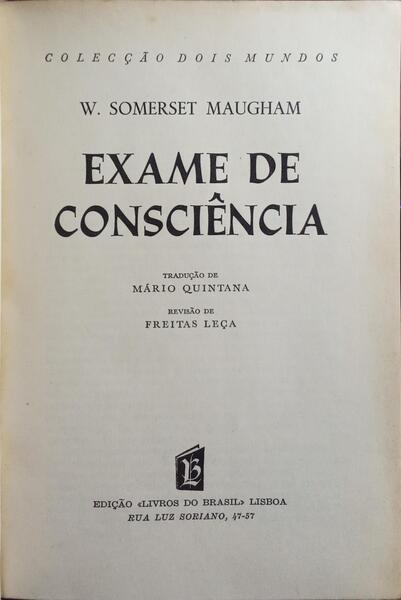 Clique nas imagens para aumentar. SOMERSET MAUGHAM. (William) EXAME DE CONSCIÊNCIA.Tradução de Mário Quintana. Revista de Freitas Leça. Colecção Dois Mundos, 35. Edição Livros do Brasil. Lisboa. [D.L. 1974]. De 21x15 cm. Com 293, [iii] págs. Encadernação com lombada e cantos em pele, rótulos e ferros a ouro na lombada. Folhas de guarda decorativas. Exemplar com ligeiras falhas superficiais de pele.