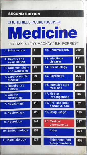 Clique nas imagens para aumentar. HAYES. (Peter C.), Thomas W. Mackay e Ewan H. Forrest. CHURCHILL'S POCKETBOOK OF MEDICINE.[Por]..., MD PhD FRCP (Edin) [...], ... BSc Hons MRCP [...] e... Bmed Biol Hons MBChB MRCP, [...]. Second Edition. Churchill Livingstone. Edinburgh. 1998. De 18x11,5 cm. Com xv, 404, [iii] págs. Encadernação do editor com as pastas flexíveis. Inclui fita marcadora. Ilustrado.