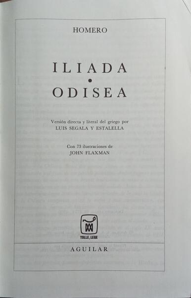 Clique nas imagens para aumentar. HOMERO. ILIADA. ODISEA.Versión directa y literal del griego por Luis Segala y Estalella. Con 73 ilustraciones de John Flaxman. Aguilar. Madrid. 1970. De 19x13 cm. Com 935, [i] págs. Encadernação do editor inteira de percalina castanha, inclui fita marcadora em tira de cetim. Ilustrado no texto com desenhos a preto e branco de John Flazman, e em extratexto com um busto do autor. Exemplar com assinatura de posse na lápis na folha de guarda. Referência: 2509RS675
