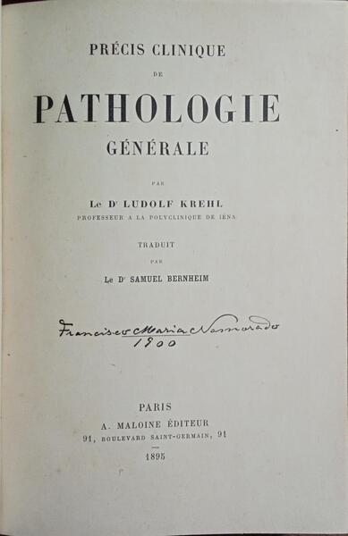Clique nas imagens para aumentar. KREHL. (Ludolf) PRÉCIS CLINIQUE DE PATHOLOGIE GÉNÉRALE.Par Le Dr... Professeur a la Polyclinique de Iena. Traduit para Le Dr. Samuel Bernheim. A. Maloine Éditeur. Paris. 1895. De 23x15,5 cm. Com [vi], 398, [ii] págs. Encadernação do editor. Exemplar com leves desgastes nas pastas, algumas manchas de humidade e assinatura de posse na folha de rosto. Referência: 2510DG055