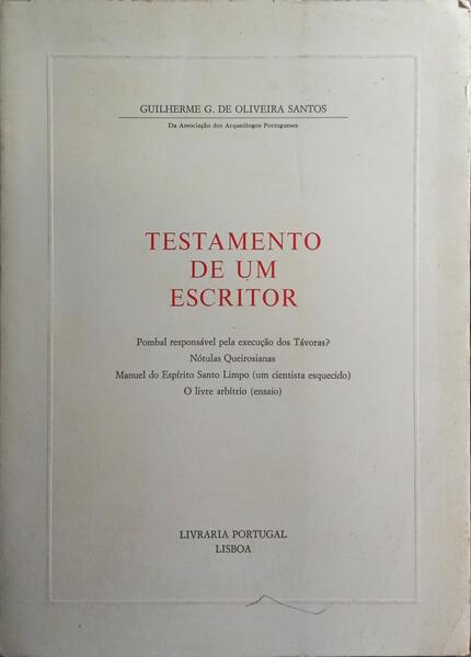 Clique nas imagens para aumentar. OLIVEIRA SANTOS. (Guilherme G. de) TESTAMENTO DE UM ESCRITOR.1 Pombal ressponsável pela execução dos távoras? 2 Nótulas Queirosianas. 3 Manuel do Espírito Santo Limpo (Um cientista esquecido). 4 O Livre Arbítrio (Ensaio). [Por]... Da Associação dos Arqueólogos Potuguses.Livraria Portugal. Lisboa. 1988. De 24x17 cm. Com 293, [ii] págs. Brochado. Ilustrado no texto com gravuras, fac-símile e fotografias a preto e branco. Exemplar com leves sinais de manuseamento na lombada, etiqueta no verso da folha de guarda anterior e algumas manchas de humidade. Referência: 2510DG075