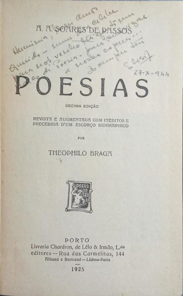 Clique nas imagens para aumentar. SOARES DE PASSOS. (A. A.) POESIAS. [10.ª EDIÇÃO - ENC.]Décima Edição revista e augmentada com ineditos e precedida d"um escorço biographico por Theophilo Braga. Livraria Chardron, de Lello &; Irmão, L.da Editores Aillaud e Bertrand. Porto. 1925. De 19x12,5 cm. Com 268 págs. Encadernação do Editor. Ilustrado com fotografia de Soares de Passos na face a folha de rosto e com cabeções decorados no início de cada poema. Exemplar com algumas manchas de humidade.