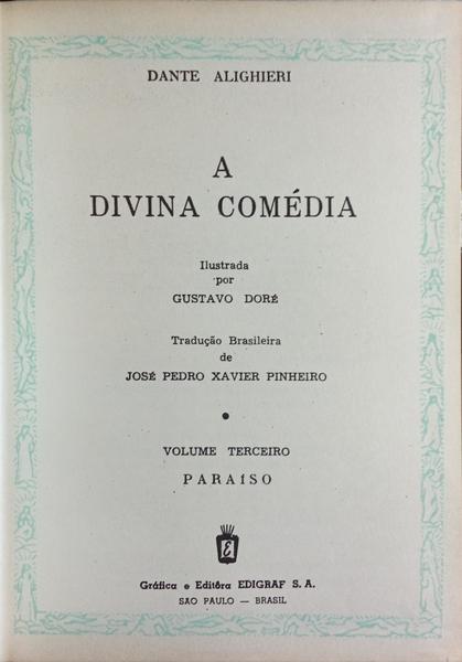 Clique nas imagens para aumentar. ALIGHIERI. (Dante) A DIVINA COMÉDIA. [3 VOLS.]Volume I - O Inferno. [Volume II - O Purgatório; Volume III - O Paraíso]. Ilustrada por Gustavo Doré. Tradução Brasileira de José Pedro Xavier Pinheiro. Gráfica e Editôra Edigraf S.A. São Paulo. 1965. 3 volumes de 18,5x14 cm. Com 260, [iii]; 228, [iv]; 209, [iv] págs. Encadernações em percalina com ferros a ouro nas lombadas. Ilustrados com reprodução de retrato do autor a cores, em face da folha de rosto. Exemplar com algumas manchas de humidade. Referência: 2510DG097