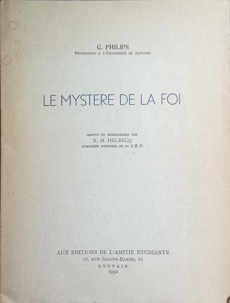 Clique nas imagens para aumentar. PHILIPS. (G.) LE MYSTERE DE LA FOI.[POR]... Professeur a l"Université de Louvain. Adapté du Néerlandais para X. M. Delbecq Aumonier National de la J. E. C. Aux Editions de L"amitie Etudiante. Louvain. 1952. De 21,5x16,5 cm. Com 46, [ii] págs. Brochado. Exemplar com algumas manchas de humidade. Referência: 2510DG188