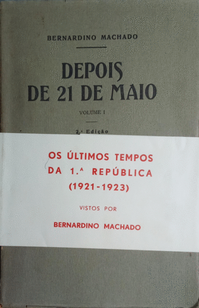 Clique nas imagens para aumentar. MACHADO. (Bernardino) DEPOIS DE 21 DE MAIO. [2.ª EDIÇÃO - C.TARJA]Volume I. 2.ª Edição. Imprensa da Universidade. Coimbra. 1923. De 20x13 cm. Com 545 págs. Brochado. Exemplar com leves sinais de manuseamento na lombada, algumas manchas de humidades, assinatura de posse na folha de rosto. Tem junto uma tarja. Referência: 2510DG206