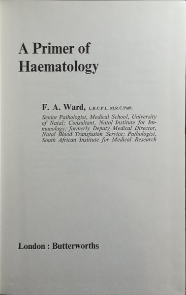 Clique nas imagens para aumentar. WARD. (F. A.) A PRIMER OF HAEMATOLOGY.[Por]..., L.R.C.P.I., M.R.C.Path. Senior Pathologist, Medical School[...] Butterworths. London. 1971. De 22x14,5 cm. Com vii, 106 págs. Encadernação do editor em percalina. Ilustrado. Tem junto recorte de jornal sobre a obra. Referência: 2510MA024