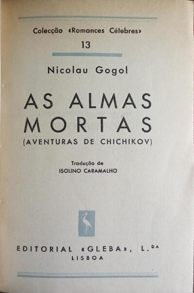 Clique nas imagens para aumentar. GOGOL. (Nikolai) AS ALMAS MORTAS.(Aventuras de Chichikov). [Por] Nicolau Gogol. Tradução de Isolino Caramalho. Colecção «Romances Célebres» 13. Editorial «Gleba». Lisboa. 1945. De 18,5x13 cm. Com 411, [v] págs. Encadernação com lombada e cantos em pele, nervos e ferros a ouro na lombada. Exemplar preserva as capas de brochura e assinatura de posse na folha de anterrosto. Referência: 2510MA098