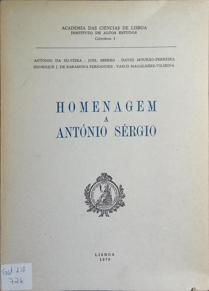 De 24x17,5 cm. Com 145, [vi] págs. Brochado. Ilustrado em extratexto com um retrato de António Sérgio face à folha de rosto. Exemplar com etiqueta de cota na capa anterior.