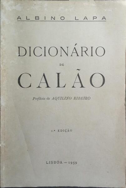 Clique nas imagens para aumentar. LAPA. (Albino) DICIONÁRIO DE CALÃOPrefácio de Aquilino Ribeiro. 1.ª Edição. Lisboa. 1959. De 22x15 cm. Com xxxii,217, [xv] págs. Brochado. Ilustrado em extratexto com gravuras. Exemplar com etiqueta da Tabacaria da Sorte na primeira folha preliminar, carimbo oleográfico de posse de Tibério D’Avila Brasil, médico-cirurgião de S. Roque do Pico-Açores na folha de anterrosto, lombada manuseada e etiqueta da Livraria Barata na capa posterior. Obra com um prefácio de Aquilino Ribeiro e incluindo nas últimas 12 páginas a linguagem ideográfica dos mendigos e uma bibliografia. Referência: 2510PA146