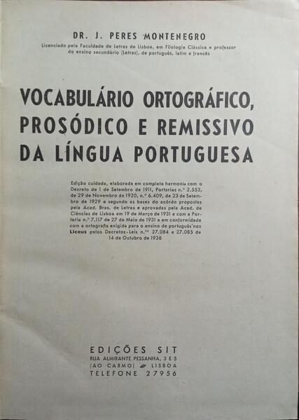 Clique nas imagens para aumentar. PERES MONTENEGRO. (J.) VOCABULÁRIO ORTOGRÁFICO PROSÓDICO E REMISSIVO DA LÍNGUA PORTUGUESA.[Por] Dr. ... Licenciado pela Faculdade de Letras de Lisboa, em Filologia Clássica e professor do ensino Secundário (Letras), de português, latim e francês. Edições SIT-Sociedade Industrial de Tipografia. Lisboa. S.d. [1937?] De 21x16 cm. Com xx, 688 págs. Encadernação inteira em tecido, com rótulo e ferros a ouro na lombada. Exemplar com picos de humidade nas folhas de guarda. Data retirada do Prefácio e da PorBase. Na folha de rosto contém a seguinte nota: Edição cuidada, elaborada em completa harmonia com o Decreto de 1 de Setembro de 1911, Portarias n.º 2553, de 29 de Novembro de 1920, n.º 6409, de 23 de Setembro de 1929 e segundo as bases do acôrdo propostas pela Acad. Bras. de Letras e aprovadas pela Acad. de Ciências de Lisboa em 19 de Março de 1931 e com a Portaria n.º 7117 de 27 de Maio de 1931 e em conformidade com a ortografia exigida para o ensino de português nos Liceus pelos Decretos-Leis n.ᵒˢ 27084 e 27085 de 14 de Outubro de 1936. Referência: 2510PA165