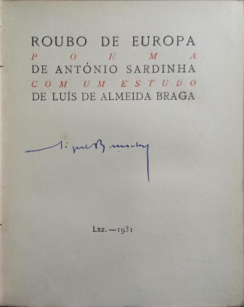 Clique nas imagens para aumentar. SARDINHA. (António) e Luís de Almeida Braga. ROUBO DE EUROPA.Poema de... Com um estudo de... Valentino de Sá. Lisboa. 1931 De 18x15 cm. Com xxxiv, 24, [iii] págs. Encadernação inteira em pele, com nervos, rótulo e ferros a ouro. Com corte das folhas carminado à cabeça, folhas de guarda em papel marmoreado e marcador em tira de cetim. Preserva as capas de brochura. Exemplar N.º 129 de uma tiragem especial de 50 com assinatura de posse na folha de rosto. Referência: 2510PA197