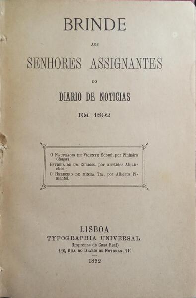 Contém as seguintes obras: O Naufragio de Vicente Sodré, por Pinheiro Chagas; Estreia de um Curioso, por Aristides Abranches; e O Herdeiro de Minha Tia, por Alberto Pimentel.