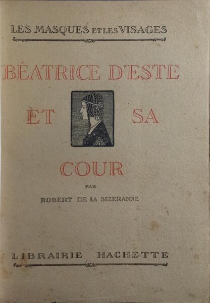 Clique nas imagens para aumentar. DE LA SIZERANNE. (Robert) BÉATRICE D'ESTE ET SA COUR.Neuvième Mille. Les Marques et les Visages. Livrairie Hachette. Paris. 1926. De 22x16 cm. Com ix, 212, [ii] págs. Encadernação com lombada e cantos em pele, com nervos, rótulos e ferros a ouro na lombada. Corte das folhas carminado à cabeça, fita marcadora em tira de cetim e preserva as capas de brochura. Ilustrado em extratexto com gravuras a preto e branco, sobre papel couché. Exemplar com etiqueta do encadernador na folha de guarda e assinatura de posse coeva na folha de anterrosto.