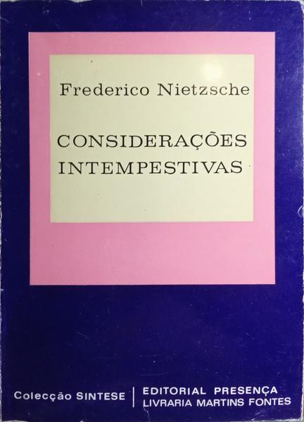 Clique nas imagens para aumentar. NIETZSCHE. (Friedrich Wilhelm) CONSIDERAÇÕES INTEMPESTIVAS.[Por] Friedrico Nietzsche. Tradução de Lemos de Azevedo. Colecção Síntese, 23. Livraria Martins Fontes. Editorial Presença. Lisboa. 1976. De 20x15 cm. Com 210, [ii] págs. Brochado. Referência: 2510RS282