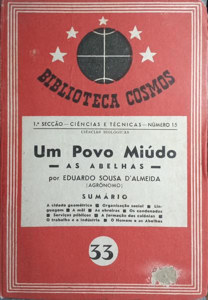 Clique nas imagens para aumentar. SOUSA DE ALMEIDA. (Eduardo) UM POVO MIÚDO. NOTAS SÔBRE A VIDA DAS ABELHAS.Por Eduardo Sousa d’Almeida, Agrónomo. Biblioteca Cosmos. Direcção do Prof. Bento de Jesus Caraça (da Universidade Técnica de Lisboa). N.º 33. 1.ª secção. Núm.º 15, Ciências e Técnicas. c) Ciências Biológicas. Cosmos. Lisboa. 1943. De 19x13 cm. Com 153, [vii] págs. Encadernação cartonada do editor. Ilustrado no texto com gravuras a preto e branco. Exemplar com danos de manuseamento nas pastas, mancha de humidade na pasta posterior e folhas preliminares. Referência: 2510RS288