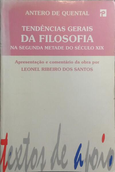 Clique nas imagens para aumentar. QUENTAL. (Antero de) TENDÊNCIAS GERAIS DA FILOSOFIA NA SEGUNDA METADE DO SÉCULO XIX.Apresentação e comentário por Leonel Ribeiro dos Santos. 1.ª Edição. Texto de Apoio, 63. Editorial Presença. Lisboa. 1995. De 21,5x14,5 cm. Com 135 págs. Brochado. Ilustrado com uma fotografia do autor na pág. xi. Exemplar com ligeira perda de cor na lombada, sublinhados e algumas notas a lápis. Referência: 2510RS484