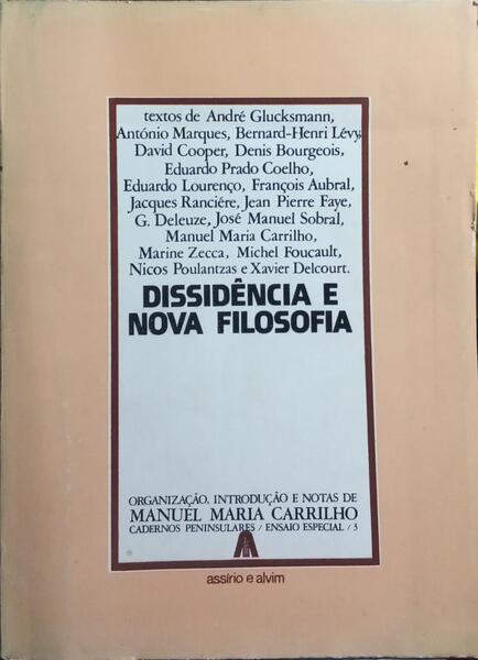 Clique nas imagens para aumentar. GLUCKSMANN. (André) DISSIDÊNCIA E NOVA FILOSOFIA.Textos de... Organização, introdução e notas de Manuel Maria Carrilho. Cadernos Penunsulares: Ensaio Especial, N.º 3. Assírio & Alvim. Lisboa. 1979. De 22x16 cm. Com 166, [i] págs. Brochado. Ilustrado no texto a preto e branco. Exemplar com as capas manuseadas, etiqueta da editora na folha de guarda e com falta da 3.ª folha. Reúne textos de..., António Marques, Bernard-Henri Lévy, David Cooper, Denis Bourgeois, Eduardo Prado Coelho, Eduardo Lourenço, François Aubral, Jacques Ranciére, Jean Pierre Faye, G. Deleuze, José Manuel Sobral, Manuel Maria Carilho, Marine Zecca, Michel Foucault, Nicos Poulantzas e Xavier Delcourt. Referência: 2510RS708