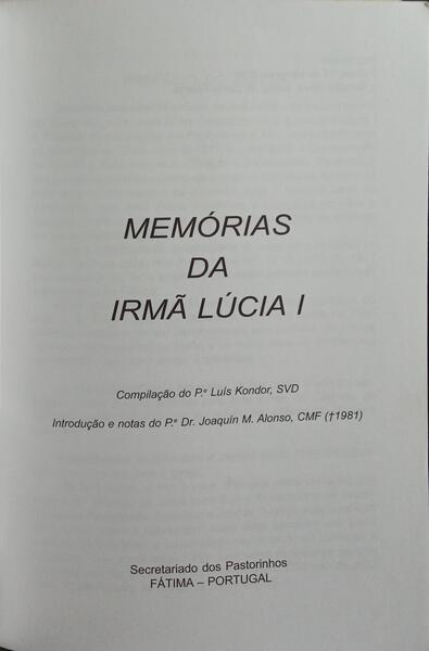 Clique nas imagens para aumentar. SANTOS. (Lúcia dos) MEMÓRIAS DA IRMÃ LÚCIA. [2 VOLS. - 9.ª EDIÇÃO]Compilação do Pe. Luís Kondor, SVD. Introdução e notas do P.e Dr. Joaquín M. Alonso, CMF, (+1981). 9.ª Edição [Vol. II - 5.ª e 6.ª Memórias. Compilação do P.e Luís Kondor, SVD. Introduções e notas do P.e Dr. Luciano Cristino. 3.ª e 2.ª Edição]. Secretariado dos Pastorinhos. Fátima. 2004. 2 Volumes de 20x14 cm. Com 237, [iii]; 191, [v] págs. Brochados. Ilustrados nos textos com fac-simile e fotografias a preto e branco. Exemplar com etiqueta do editor no segundo volume. Referência: 2511DG305