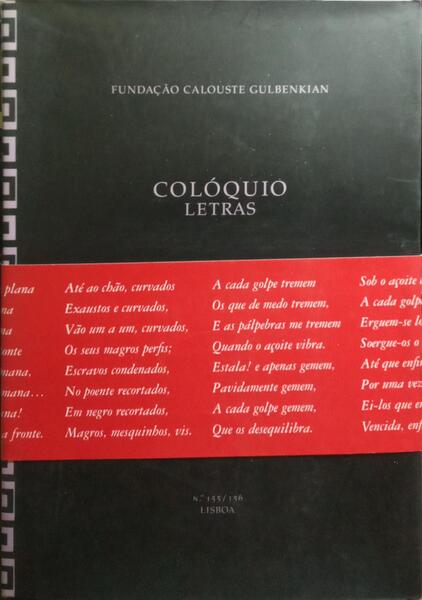 Clique nas imagens para aumentar. COLÓQUIO LETRAS, N.º 155-156, JANEIRO-JUNHO 2000. [C/TARJA]Revista Trimestral. Directores Joana Morais Varela. Fundação Calouste Gulbenkian. Lisboa. 2000. 2 Volumes de 24,5x17 cm. Com 469, [iii]; 65, [v] págs. Brochados com sobrecapa de proteção. Ilustrado no texto com fotografias a preto e branco e fac-símile. Exemplar com tarja comercial. Tem junto: Seis cartas de Camilo Pessanha e um postal acondicionado numa bolsa de papel. PESSANHA. (Camilo) CLEPSYDRA. Ensaio de Edição de Gustavo Ruim. Desenho de Cruzeiro Seixas. Colóquio/Letras. Lisboa. Obra impressa sobre papel assaz encorpado. Contém vários artigos, entre eles:'Os Lusíadas' e a vaidade da poesia, artigo por João Ricardo Figueiredo; O segredo de Camilo Pessanha e Ana de Castro Osório, artigo por António Osório; Recordações de Portugal em Bengala, artigo por Sisir Kumar Das; Afonso Lopes Vieira: notas sobre os (des)encontros entre gerações e apontamentos para uma edição genética de 'Bartolomeu Marinheiro', artigo por Cristina Nobre.