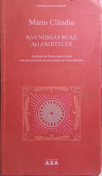 Clique nas imagens para aumentar. CLÁUDIO. (Mário) NAS NOSSAS RUAS, AO ANOITECER. [1.ª EDIÇÃO]Antologia de Poesia sobre Lisboa com um pormenor de uma pintura de Carlos Botelho. 1.ª Edição. Colecção Pequeno Formato, 8. Edições Asa. Lisboa. 2002. De 23x13,5 cm. Com 54, [x] págs. Brochado. Ilustrado no texto com uma pintura colada. Exemplar com alguns sublinhados e notas a lápis. Mário Cláudio é pseudónimo de Rui Manuel Pinto Barbot Costa. Referência: 2511MA009
