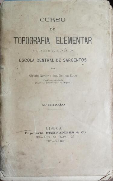 Clique nas imagens para aumentar. SANTOS LOBO. (Viriato Sertorio dos) CURSO DE TOPOGRAFIA ELEMENTAR.Segundo o programa da Escola Central de Sargentos por..., Capitão de Cavalaria, Director da Escola Central de Sargento. 2.ª Edição. Papelaria Fernandes & C.ª. Lisboa. 1917. De 20,5x12,5 cm. Com 418 págs. Brochado. Ilustrado. Exemplar com danos na lombada e nas capas, assinatura de posse na folha de rosto e carimbo oleográfico na página 7. Referência: 2511MA133
