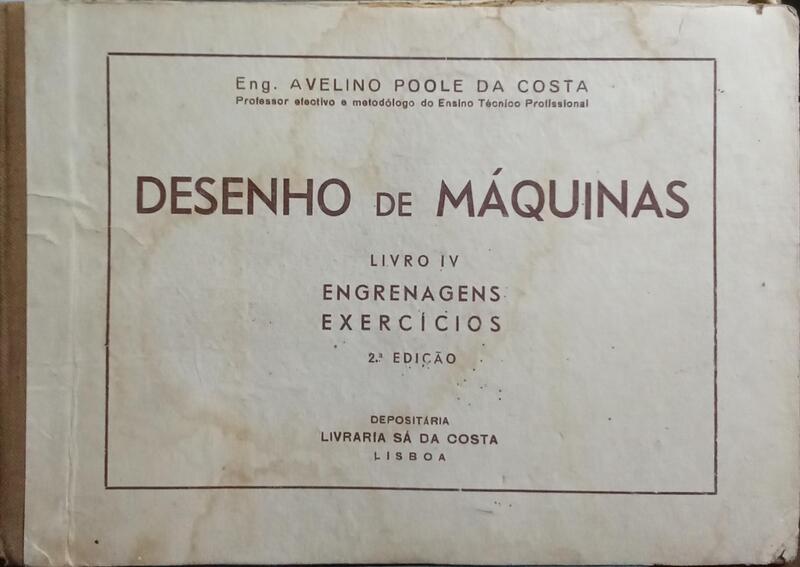 Clique nas imagens para aumentar. POOLE DA COSTA. (Avelino) DESENHO DE MÁQUINAS: LIVRO IV - ENGRENAGENS, EXERCÍCIOS. [2.ª EDIÇÃO][Por]... Engenheiro Electrotécnico e Mecânico I. S. T. [Instituto Superior Técnico] Professor efectivo da Escola Industrial de Afonso Domingues. 2.ª Edição. Depositária Livraria Sá da Costa. Lisboa. 1959. Livro oblongo de 15,5x21,5 cm. Com 77, [xvii] págs. Encadernação do editor com lombada em tela. Profusamente ilustrado com gravuras e figuras exemplificativas, tabelas e quadros e vários exercícios, em extratexto, nas últimas páginas não numeradas, ilustrados com a respetiva resolução, em folhas desdobráveis. Exemplar com danos na lombada e manchas de humidade nas pastas.