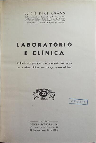 Clique nas imagens para aumentar. DIAS AMADO. (Luís E.) LABORATÓRIO E CLÍNICA.Colheitas dos produtos e interpretações dos dados das análises clínicas nas crianças e nos adultos. [Por]... Ex-1.º Assistente da Faculdade de Medicina da Universidade de Lisboa, Chefe de Serviço dos Serviços de Análises Clínicas dos Hospitais Civis de Lisboa e Investigador do Instituto Português de Oncologia. Gomes & Rodrigues Editores. Lisboa. 1956 [?]. De 24x16 cm. Com 912, [i] págs. Encadernação cartonada do editor com gravações a ouro na lombada e folhas de guarda ilustradas. Ilustrado com tabelas. Exemplar com lombada manuseada. Referência: 2511MA165