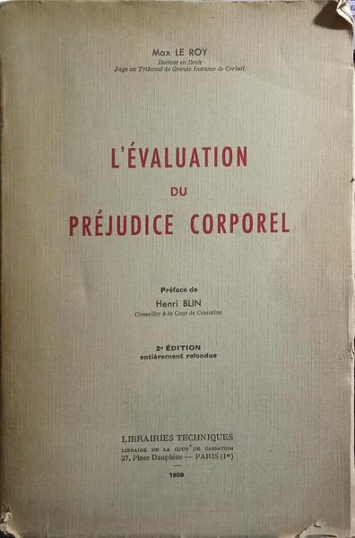 Clique nas imagens para aumentar. LE ROY. (Max) L'ÉVALUATION DU PRÉJUDICE CORPOREL.[Por]... Docteur en Droil, Juge au Tribunal de Grande Instance de Corbeil. Préface de Henri Blin, Conseiller à la Cour de Cassation. 2e Édition entlèrement refondue. Librairies Techniques. Paris. 1959. De 25x16,5 cm. Com x, 191, [i] págs. Brochado. Ilustrado com tabelas. Exemplar parcialmente por abrir, com etiqueta da Livraria Ferim na folha de guarda, danos na lombada e nas margens das capas. Referência: 2511MA273