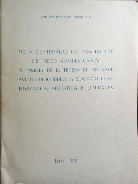 Clique nas imagens para aumentar. SOUSA LEITE. (António Pedro de) NO V CENTENÁRIO DO NASCIMENTO DE PEDRO ÁLVARES CABRAL. [DED.]A família de D. Teresa de Andrade, avó do descobridor: sua projeção histórica, artística e literária. Lisboa. 1969. De 27x20,5 cm. Com 32 págs. Brochado. Ilustrado no texto com fotografias a preto e branco. Contém três desdobráveis com árvores genealógicas. Exemplar com dedicatória do autor ao Dr. Caetano de Carvalho. Separata dos n.º 45, 46 e 47 do «Boletim da Academia Portuguesa de Ex-libris».