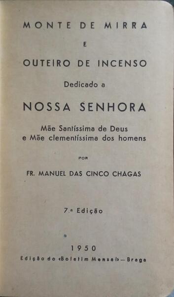 Clique nas imagens para aumentar. CINCO CHAGAS. (Manuel das) MONTE DE MIRRA E OUTEIRO DE INCENSO DEDICADO A NOSSA SENHORA. [7.ª EDIÇÃO]Mãe Santíssima de Deus e Mãe clementíssima dos homens. Por Fr... 7.ª Edição. Edição do «Boletim Mensa». Braga. 1950. De 14,5x9 cm. Com [vii], 632 págs. Encadernação em percalina com folhas de guarda em papel decorativo, corte das folhas douradas e marcador de páginas em fita verde. Referência: 2511MA307