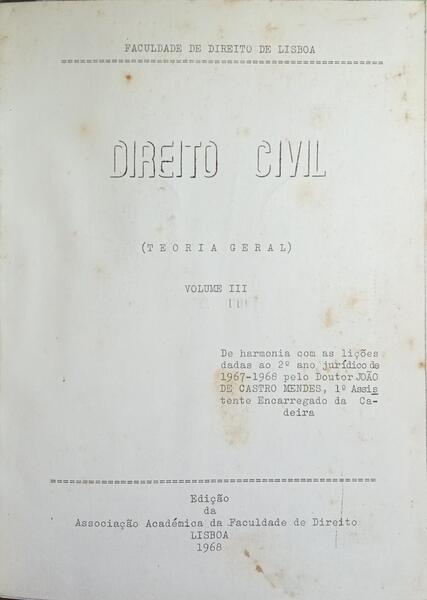 Clique nas imagens para aumentar. CASTRO MENDES. (João de) DIREITO CIVIL, TEORIA GERAL. [EDIÇÃO 1967]De harmonia com as lições dadas ao 2.º ano jurídico de 1967-1968 pelo Doutor..., com Assistência do Titular da Cadeira, Prof. Paulo Cunha. Faculdade de Direito de Lisboa. [Volume II; Volume III]. Associação Académica da Faculdade de Direito de Lisboa. 1967 e 1968. 3 Volumes encadernados em dois de 23x18 cm. Com 340; 170; 545 págs. Encadernações com lombadas e cantos em pele, e ferros a ouro nas lombadas. Incluem as iniciais J.C.R. a ouro no pé das lombadas. Dactilopolicopiados. Exemplares com ligeiras manchas de humidade e assinatura de posse a lápis na folha de rosto do primeiro volume. Obra de carácter introdutório descrevendo o ornamento jurídico português em matéria de direito civil. Densamente anotado e vertido a partir das lições do autor na Faculdade de Direto de Lisboa, este estudo constitui uma ferramenta de trabalho de grande utilidade a estudantes e profissionais. Referência: 2511RS057