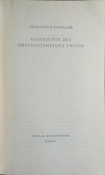 Clique nas imagens para aumentar. SCHILLER. (Friedrich) GESCHICHTE DES DREISSIGJÄHRIGEN KRIEGS.Verlag Birkhäuser. Basel. 1946. De 20x13 cm. Com ix, 505, [ii] págs. Encadernação do editor com lombada em tela. Friedrich Schiller é nome literário de Johann Christoph Friedrich von Schiller (Marbach am Neckar, 1759 — Weimar, 1805), foi um poeta, filósofo, médico e historiador alemão. Foi um dos grandes homens de letras da Alemanha do século XVIII e, assim como Goethe, Wieland e Herder, é um dos principais representantes do Classicismo de Weimar. Referência: 2511RS108