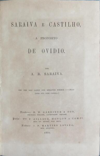 Clique nas imagens para aumentar. RIBEIRO SARAIVA. (António) SARAIVA E CASTILHO, A PROPOSITO DE OVIDIO.B. W. Gardiner &; Son. Vva P. Allaud, Monlon e Compª. J. P. Martins Lavado. Londres. Paris. Lisboa. 1862. De 19,5x13,5 cm. Com xii, 329, [ii] págs. Encadernação com lombada em tela e ferros a ouro. Pastas em papel marmoreado e corte das folhas mosqueado. Ilustrado, nas folhas que antecedem a folha de rosto, com retratos de Castilho e de António Ribeiro Saraiva, sobre papel mais encorpado. Contém a seguinte citação na folha de rosto: Nec pes nec caput uni redatur forme - Horat. (sem pés nem cabeça.) Páginas em numeração romana com uma Carta Preambular do autor dirigida a António Feleciano de Castilho de Londres, 8 de Julho de 1862. Inocêncio I, 256; VIII, 296 e XX, 264. Referência: 2511RS128