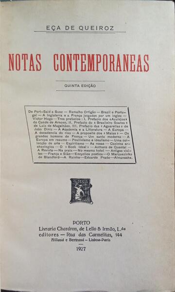 Clique nas imagens para aumentar. EÇA DE QUEIRÓS. (José Maria de) NOTAS CONTEMPORANEAS.[Por] Eça de Queiroz. Quinta Edição. Livraria Chardron, de Lelo & Irmão, editores. Porto. 1927. De 19,5x12,5 cm. Com 522 págs. Encadernação com lombada em pele, com nervos, rótulos e ferros a ouro. Pastas e folhas de guarda em papel decorativo, corte das folhas caminado à cabeça e preserva as capas de brochura. Inclui fita em tira de cetim. Ilustrado em face da folha de rosto com um retrato a preto e branco do autor. As páginas preliminares apresentam um texto de homenagem dos editores ao autor e o prólogo ao leitor da primeira edição. Seguem-se 32 textos, prefácios e artigos publicados em vários órgãos da imprensa escrita, entre eles a célebre descrição da Inauguração do Canal de Suez. Tem o seguinte índice de artigos na folha de rosto: