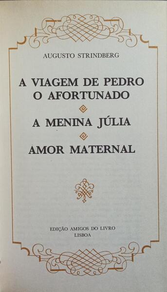 Clique nas imagens para aumentar. STRINDBERG. (August) A VIAGEM DE PEDRO, O AFORTUNADO. A MENINA JÚLIA. AMOR MATERNAL.[Por] Augusto Strindberg. Grandes Clássicos da Literatura Mundial. Edição Amigos do Livro. Lisboa. [D.L. 1977] De 20x12,5 cm. Com 305, [vi] págs. Encadernação do editor, com fita marcadora em tira de cetim. Ilustrado em extratexto com gravuras a preto e branco. Referência: 2511RS222