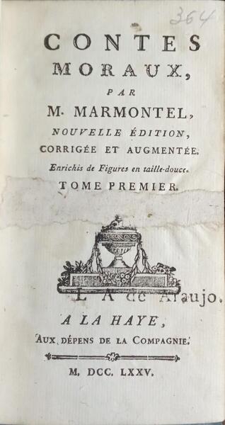 Par M. MARMONTEL, Nouvelle Édition, Corrigée et Augmentée. Enrichis de Figures en taille-douce. Tome Premier [au Tome Troisieme]. A LA HAYE, Aux dépens de la Compagnie. M. DCC. LXXV. [1775]